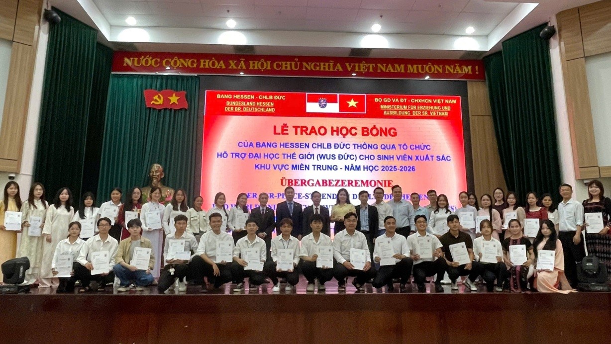 Ngày 20/3/2026, Đại học Đà Nẵng (ĐHĐN) phối hợp với Văn phòng Hessen tại Việt Nam tổ chức Lễ trao Học bổng của Bộ Khoa học và Nghệ thuật Bang Hessen CHLB Đức thông qua tổ chức Hỗ trợ Đại học Thế giới (WUS Đức) cho sinh viên khu vực miền Trung.